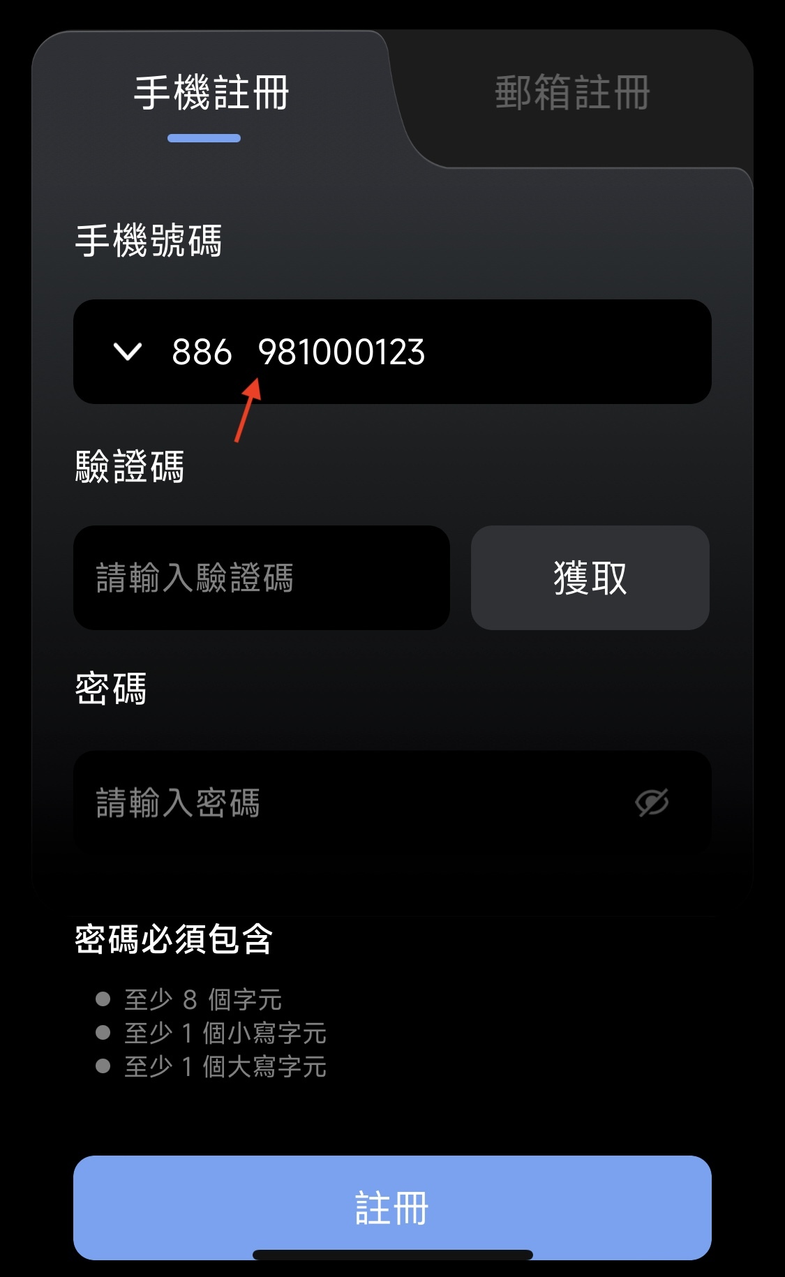 *說明一下:台灣的國際號碼請選擇"886", 另因為台灣的手機號都是09XX....開頭, 因為前面已經加了+886 國際電話碼, 所以就必須把開頭的零去掉,不然無法獲取到驗證碼去註冊哦.