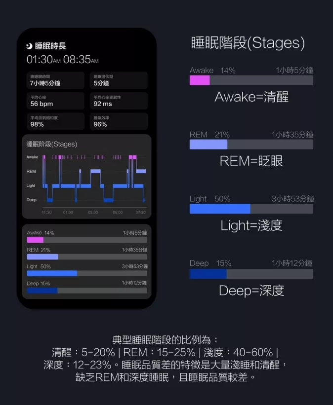 iREO智慧戒指可以詳細監測睡眠品質和模式,包括深睡眠、淺睡眠和快速動眼(REM)睡眠,提供深入的睡眠數據和分析。透過了解您的睡眠習慣,幫助您改善睡眠品質,提高精力和健康水準。